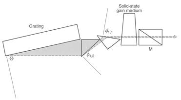 Multiple-prism near-grazing-incidence grating laser oscillator.